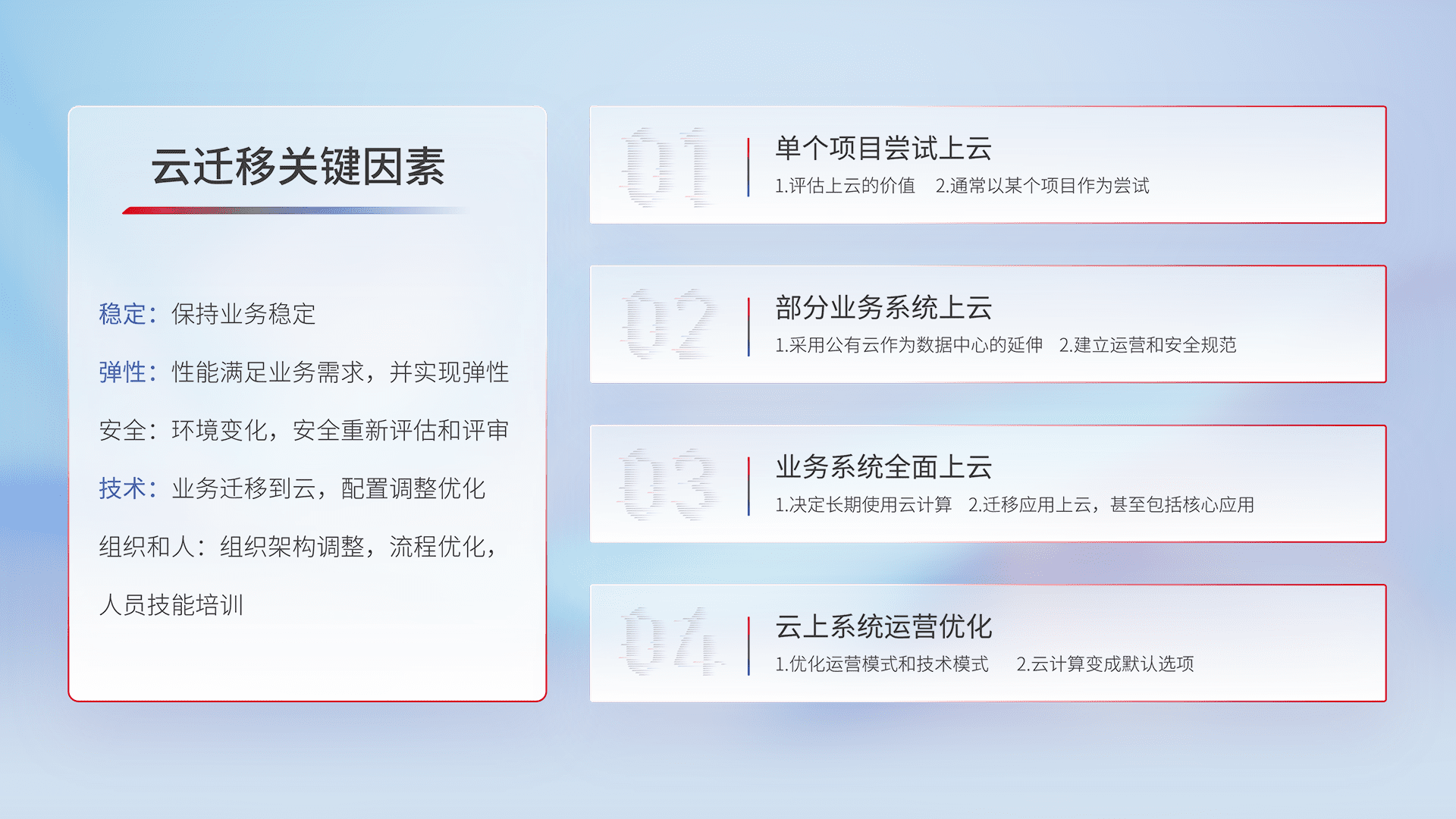结合实际业务,,,从规划设计、、、、云平台选型、、、云原生改造、、、数据迁移、、集成交付,,迁移全过程为客户识别最佳上云路径,,做好风险识别管理,,设计网络架构、、、、身份权限、、、、安全审计合规、、操作审计、、、、日志审计、、监控告警策略、、多站点容灾设计等,,,对云上基础设施进行整体规划,,,提升IT治理水平,,,以满足弹性、、、高可用、、、高性能的需求。。